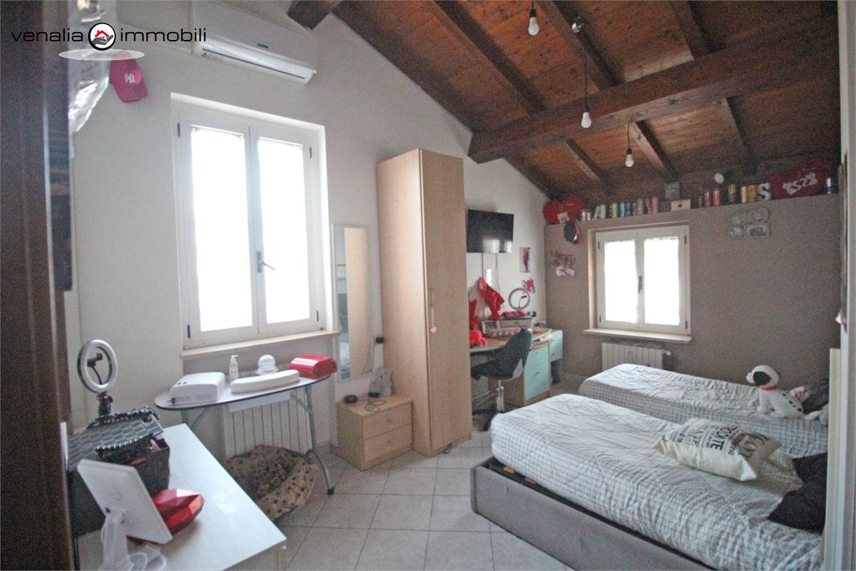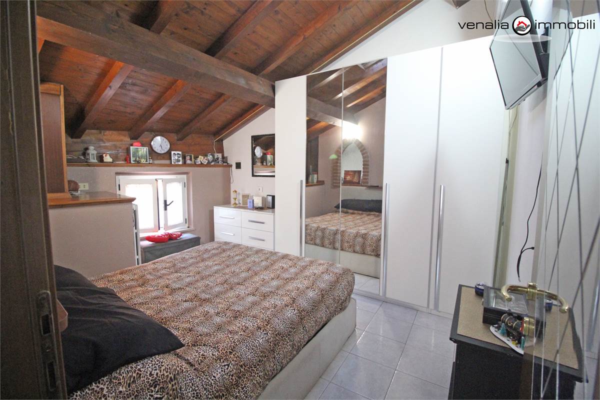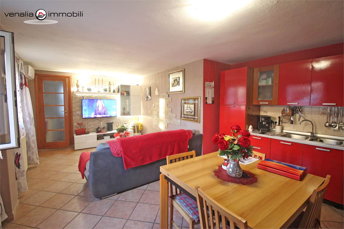 QUANDO ENTRI: La zona giorno è costituita dall' ampio soggiorno con cucina a vista, dal disimpegno, dal bagno e dalla scala che ci porta alla zona notte formata da due camere e dal bagno .
